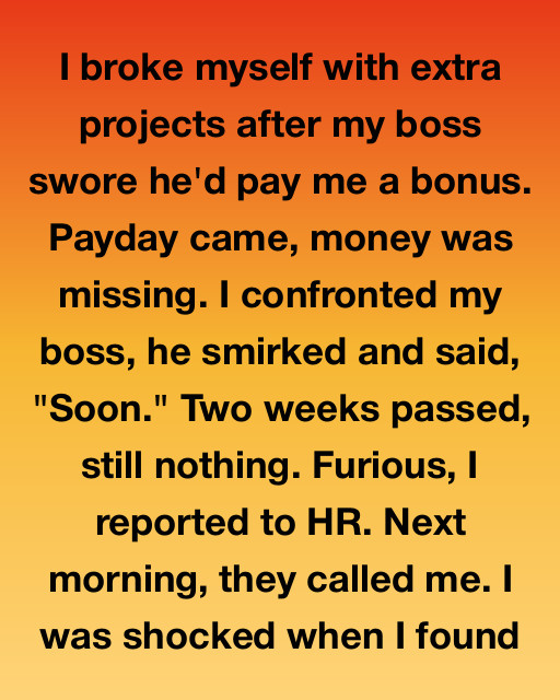 I broke myself with extra projects after my boss swore he’d pay me a bonus. Payday came, and the money was missing. I marched into his office, heart pounding, and asked him what happened. He smirked like I was a child who’d just dropped her ice cream and said, “Soon.”