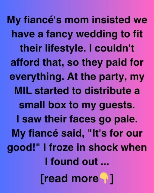 My fiancé’s mom insisted we have a fancy wedding to fit their lifestyle. I couldn’t afford that, so they paid for everything. At the party, my MIL started to distribute a small box to my guests. I saw their faces go pale. My fiancé said, “It’s for our good!” I froze in shock when I found out what was inside.