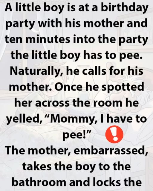 The mother, embarrassed, takes the boy to the bathroom and locks the door. She turns to the boy and says, โYou canโt be yelling across rooms that you need to pee. Itโs very rude. How about we have our own codeword? Instead of screaming โI have to peeโ you say โI have to whisperโ and then nobody will know!โ