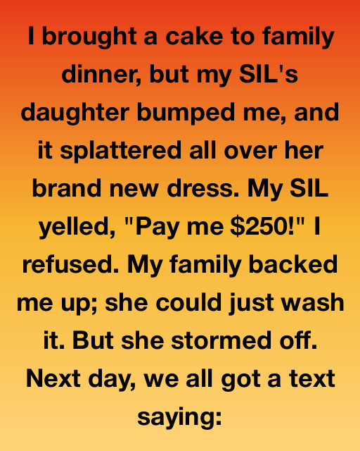 I brought a cake to family dinner, but my SIL’s daughter bumped me, and it splattered all over her brand new dress. My SIL yelled, “Pay me $250!” I refused. My family backed me up; she could just wash it. But she stormed off. Next day, we all got a text saying: