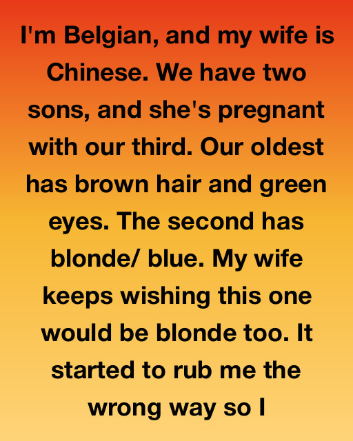 I’m Belgian, and my wife is Chinese. We have two sons, and she’s pregnant with our third. Our oldest has brown hair and green eyes. The second has blonde/blue. My wife keeps wishing this one would be blonde, too. It started to rub me the wrong way so I asked her one evening, โWhy do you keep saying that? You do know theyโre your kids too, right?โ
