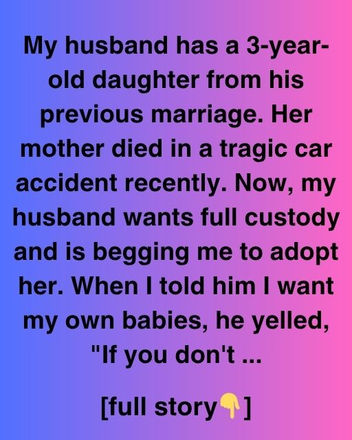 My husband has a 3-year-old daughter from his previous marriage. Her mother died in a tragic car accident recently. Now, my husband wants full custody and is begging me to adopt her. When I told him I want my own babies, he yelled, “If you don’t love her like your own, how will I ever believe you’ll love our children?”