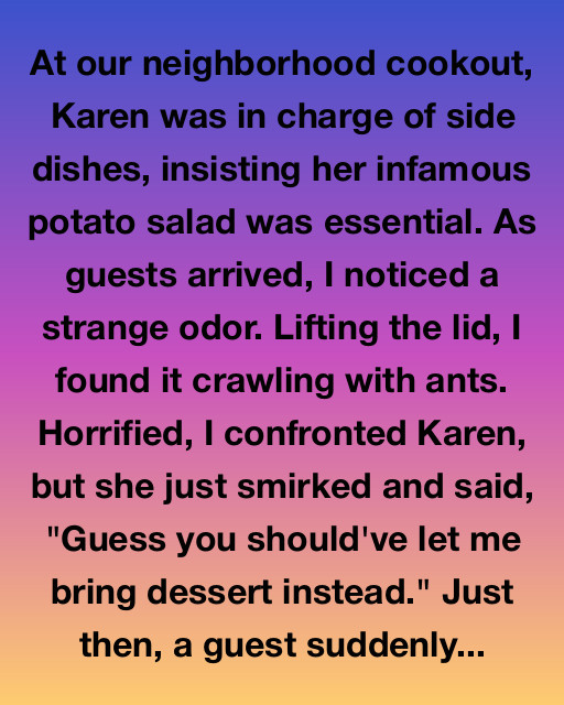 At our neighborhood cookout, Karen was in charge of side dishes, insisting her infamous potato salad was essential. As guests arrived, I noticed a strange odor. Lifting the lid, I found it crawling with ants. Horrified, I confronted Karen, but she just smirked and said, “Guess you should’ve let me bring dessert instead.” Just then, a guest suddenly began coughing, causing quite the commotion among the group.