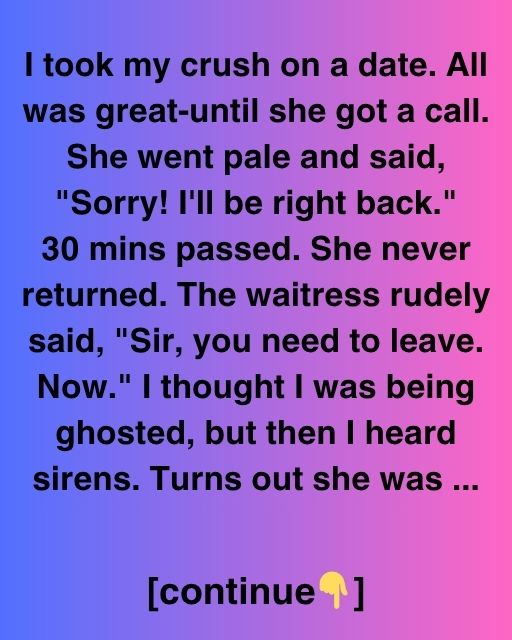 I took my crush on a date. All was greatโuntil she got a call. She went pale and said, “Sorry! I’ll be right back.” Thirty minutes passed. She never returned. The waitress rudely said, “Sir, you need to leave. Now.” I thought I was being ghosted, but then I heard sirens.