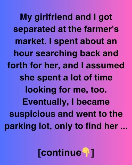My girlfriend and I got separated at the farmer’s market. I spent about an hour searching back and forth for her, and I assumed she spent a lot of time looking for me, too. Eventually, I became suspicious and went to the parking lot, only to find her sitting in the car with a smoothie in one hand, scrolling through her phone like it was just another Sunday.