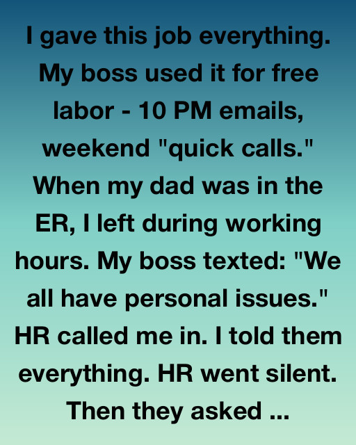 I gave this job everything. My boss used it for free labor—10 PM emails, weekend “quick calls.” When my dad was in the ER, I left during working hours. My boss texted: “We all have personal issues.” HR called me in. I told them everything. HR went silent. Then they asked, “Are you saying you’re refusing to take direction from your manager?”