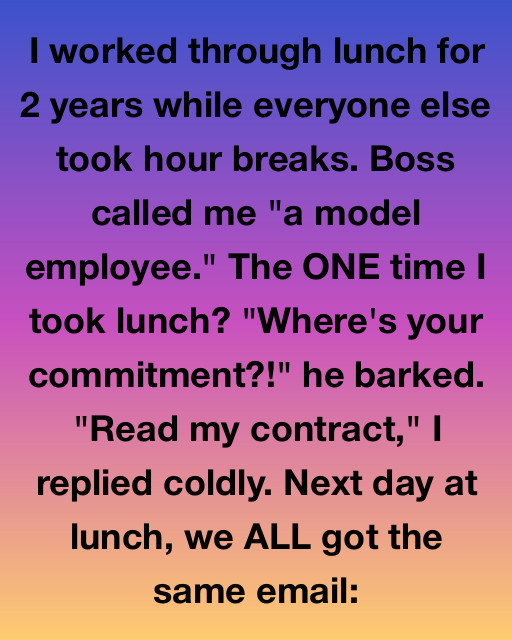 I worked through lunch for 2 years while everyone else took hour breaks. Boss called me ‘a model employee.’ The ONE time I took lunch? ‘Where’s your commitment?!’ he barked. ‘Read my contract,’ I replied coldly. Next day at lunch, we ALL got the same email: