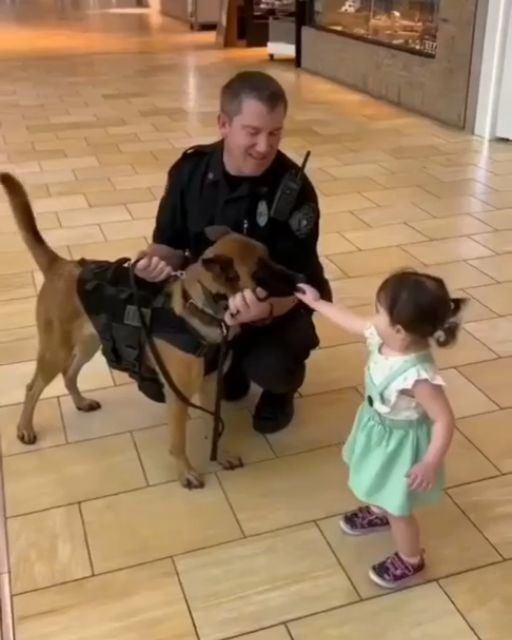 We were just killing time at the mall when she toddled over to the officer’s K-9, fearless and smiling. The dog sat still, watching her carefully as she reached out and gently touched his ear.