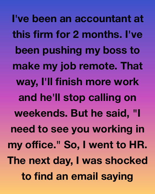 I’ve been an accountant at this firm for 2 months. I’ve been pushing my boss to make my job remote. That way, I’ll finish more work and he’ll stop calling on weekends. But he said, “I need to see you working in my office.” So, I went to HR. The next day, I was shocked to find an email saying I’d been transferred to a different department—effective immediately.