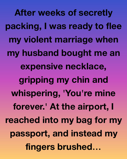 After weeks of secretly packing, I was ready to flee my violent marriage when my husband bought me an expensive necklace, gripping my chin and whispering, ‘You’re mine forever.’ At the airport, I reached into my bag for my passport, and instead my fingers brushed against the cool chain of that very necklace, a chilling reminder of the life I desperately needed to escape.