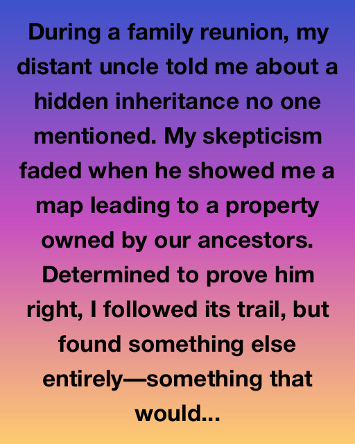 During a family reunion, my distant uncle told me about a hidden inheritance no one mentioned. My skepticism faded when he showed me a map leading to a property owned by our ancestors. Determined to prove him right, I followed its trail, but found something else entirelyโsomething that would change everything.