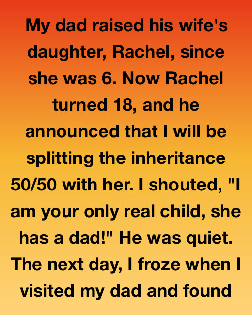 He announced that I will be splitting the inheritance 50/50 with her. He spoke simply, stating that all his accumulated assets—the house, the savings, and the small business he owned—would be divided equally between Rachel and me upon his passing. The news landed on me like a physical punch, immediately confirming my worst fears about my own diminished importance in his eyes.