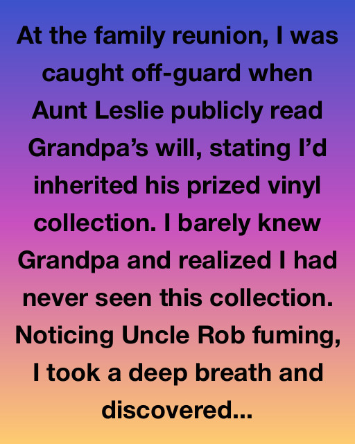 At the family reunion, I was caught off-guard when Aunt Leslie publicly read Grandpaโs will, stating Iโd inherited his prized vinyl collection. I barely knew Grandpa and realized I had never seen this collection. Noticing Uncle Rob fuming, I took a deep breath and discovered that this inheritance might lead to unexpected adventures.