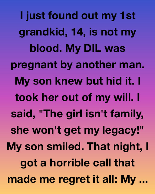 I just found out my 1st grandkid, 14, is not my blood. My daughter-in-law was pregnant by another man. My son knew but hid it. I took her out of my will. I said, “The girl isn’t family, she won’t get my legacy!” My son smiled. That night, I got a horrible call that made me regret it all: my son had collapsed at work.