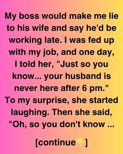 My boss would make me lie to his wife and say he’d be working late. I was fed up with my job, and one day, I told her, “Just so you know… your husband is never here after 6 pm.” To my surprise, she started laughing. Then she said, “Oh, so you don’t know…”