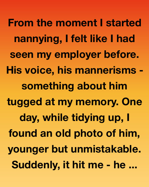From the moment I started nannying, I felt like I had seen my employer before. His voice, his mannerisms — something about him tugged at my memory. One day, while tidying up, I found an old photo of him, younger but unmistakable. Suddenly, it hit me — he was the man who used to volunteer at the foster home I grew up in.