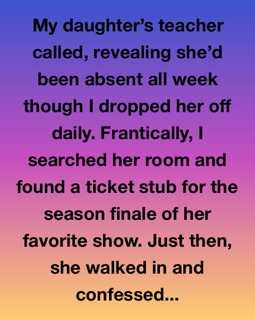 My daughterโs teacher called, revealing sheโd been absent all week though I dropped her off daily. Frantically, I searched her room and found a ticket stub for the season finale of her favorite show. Just then, she walked in and confessed.