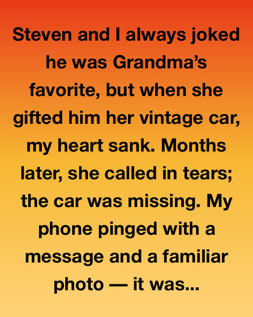 Steven and I always joked he was Grandma’s favorite, but when she gifted him her vintage car, my heart sank. Months later, she called in tears; the car was missing. My phone pinged with a message and a familiar photo — it was the vintage car, parked magnificently in front of a vast and empty parking lot.