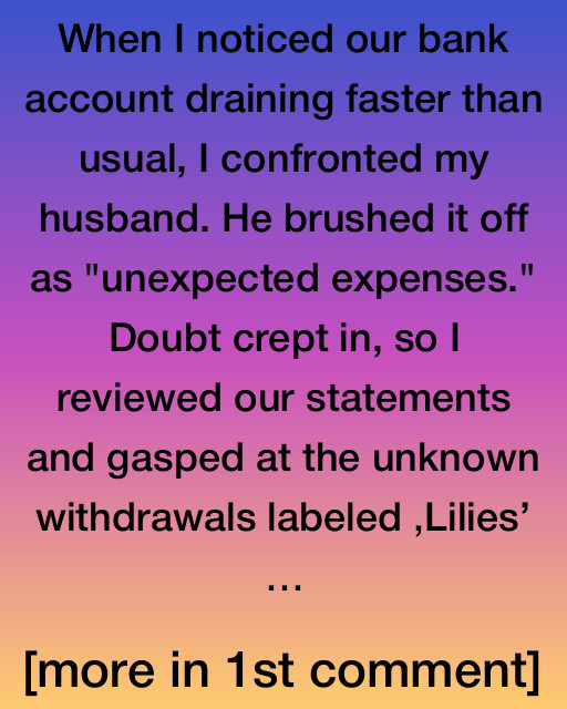 When I noticed our bank account draining faster than usual, I confronted my husband. He brushed it off as “unexpected expenses.” Doubt crept in, so I reviewed our statements and gasped at the unknown withdrawals labeled ‘Lilies.’ Confused, I asked Robert if he knew anything about it. He hesitated before saying he would look into it later. I couldn’t shake the feeling that something wasn’t right.