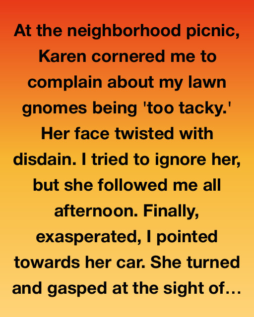 At the neighborhood picnic, Karen cornered me to complain about my lawn gnomes being ‘too tacky.’ Her face twisted with disdain. I tried to ignore her, but she followed me all afternoon. Finally, exasperated, I pointed towards her car. She turned and gasped at the sight of a mysterious note tucked into her car’s windshield wiper.