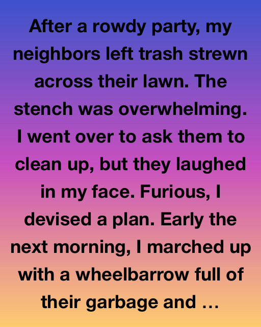 After a rowdy party, my neighbors left trash strewn across their lawn. The stench was overwhelming. I went over to ask them to clean up, but they laughed in my face. Furious, I devised a plan. Early the next morning, I marched up with a wheelbarrow full of their garbage and dumped it on their doorstep.