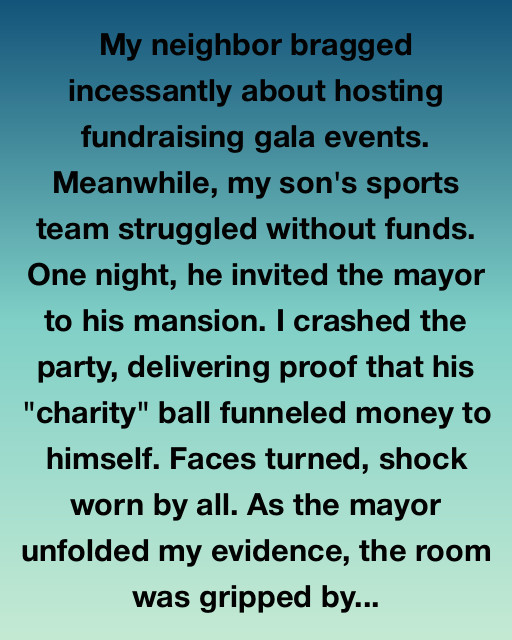 My neighbor bragged incessantly about hosting fundraising gala events. Meanwhile, my son’s sports team struggled without funds. One night, he invited the mayor to his mansion. I crashed the party, delivering proof that his “charity” ball funneled money to himself. Faces turned, shock worn by all. As the mayor unfolded my evidence, the room was gripped by a tense silence.