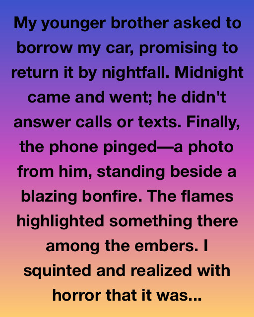 My younger brother asked to borrow my car, promising to return it by nightfall. Midnight came and went; he didn’t answer calls or texts. Finally, the phone pinged—a photo from him, standing beside a blazing bonfire. The flames highlighted something there among the embers. I squinted and realized with horror that it was indeed my car, set aflame, with Deakon, my brother, unaware of the chaos surrounding him.