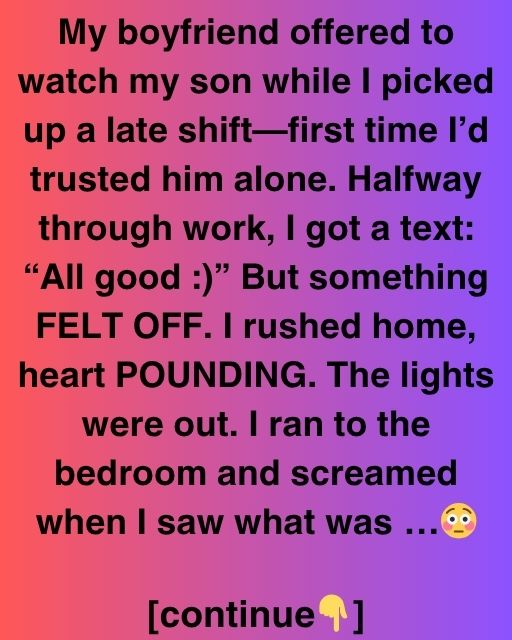 My boyfriend offered to watch my son while I picked up a late shiftโ€”first time Iโ€™d trusted him alone. Halfway through work, I got a text: โ€œAll good :)โ€ But something FELT OFF. I rushed home, heart POUNDING. The lights were out. I ran to the bedroom and screamed when I saw what was laying there.