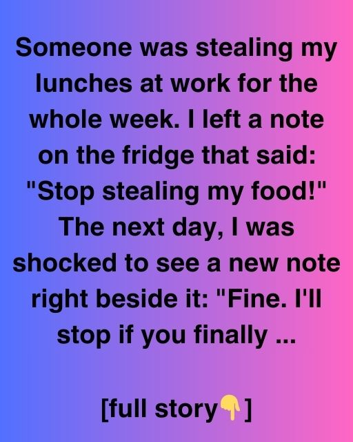 Someone was stealing my lunches at work for the whole week. I left a note on the fridge that said: “Stop stealing my food!” The next day, I was shocked to see a new note right beside it: “Fine. I’ll stop if you finally…”