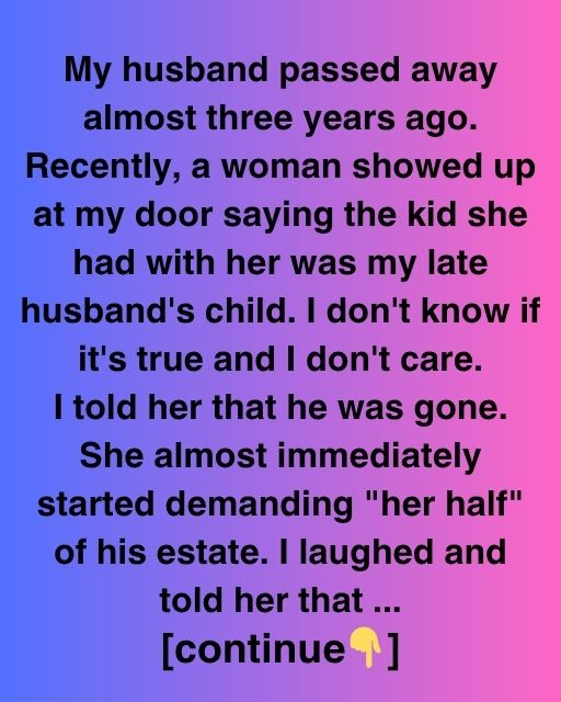 My husband passed away almost three years ago. Recently, a woman showed up at my door saying the kid she had with her was my late husband’s child. I don’t know if it’s true and I don’t care. I told her that he was gone. She almost immediately started demanding “her half” of his estate. I laughed and told her that she was three years too late and that there wasn’t even a will, let alone an “estate” to split.