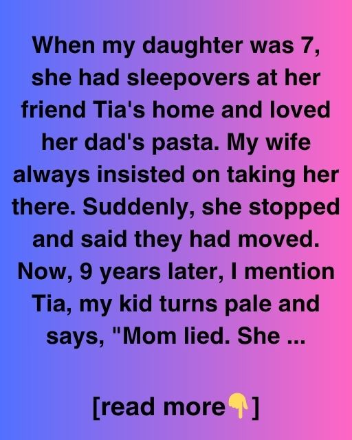 When my daughter was 7, she had sleepovers at her friend Tia’s home and loved her dad’s pasta. My wife always insisted on taking her there. Suddenly, she stopped and said they had moved. Now, 9 years later, I mention Tia, my kid turns pale and says, “Mom lied. She never moved.”