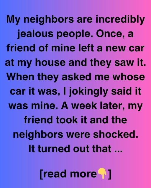 My neighbors are incredibly jealous people. Once, a friend of mine left a new car at my house and they saw it. When they asked me whose car it was, I jokingly said it was mine. A week later, my friend took it and the neighbors were shocked. It turned out that they’d already been talking behind my backโ€”saying I was showing off, bragging too much, and probably hiding something shady.