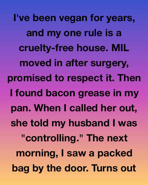 I’ve been vegan for years, and my one rule is a cruelty-free house. MIL moved in after surgery, promised to respect it. Then I found bacon grease in my pan. When I called her out, she told my husband I was “controlling.” The next morning, I saw a packed bag by the door. Turns out the bag wasn’t hers; it was my husband’s, and he was leaving, not because of the argument, but because he was hiding a massive, crippling family debt.
