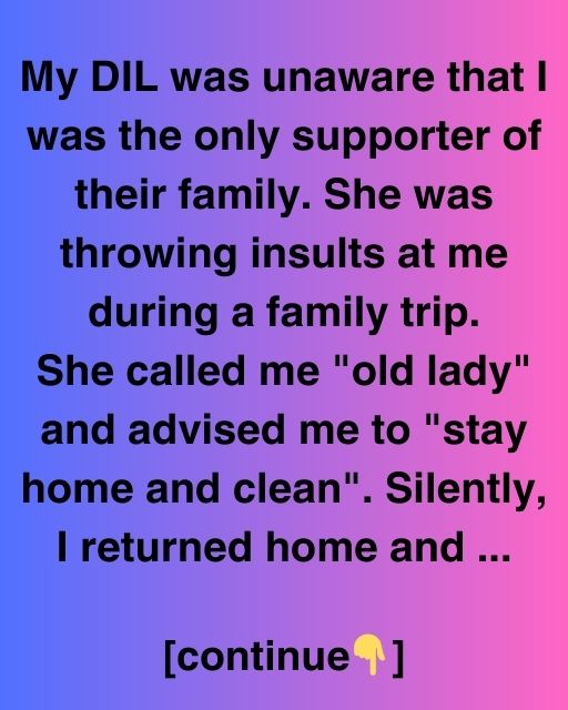 My DIL was unaware that I was the only supporter of their family. She was throwing insults at me during a family trip. She called me “old lady” and advised me to “stay home and clean”. Silently, I returned home and decided not to say a word to anyone.