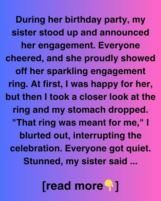 During her birthday party, my sister stood up and announced her engagement. Everyone cheered, and she proudly showed off her sparkling engagement ring. At first, I was happy for her, but then I took a closer look at the ring and my stomach dropped. ‘That ring was meant for me,’ I blurted out, interrupting the celebration. Everyone got quiet. Stunned, my sister said, ‘What are you talking about, Lia?’