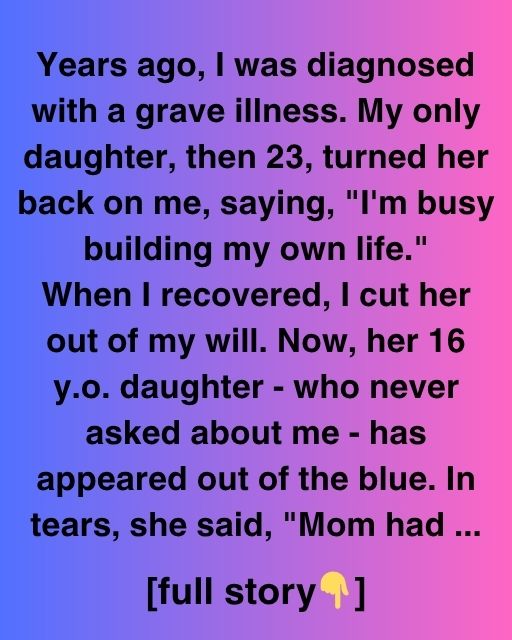 Years ago, I was diagnosed with a grave illness. My only daughter, then 23, turned her back on me, saying, “I’m busy building my own life.” When I recovered, I cut her out of my will. Now, her 16-year-old daughter โ who never asked about me โ has appeared out of the blue. In tears, she said, “Mom had a breakdown. She told me everything. And now she’s gone. I didnโt know where else to go.”