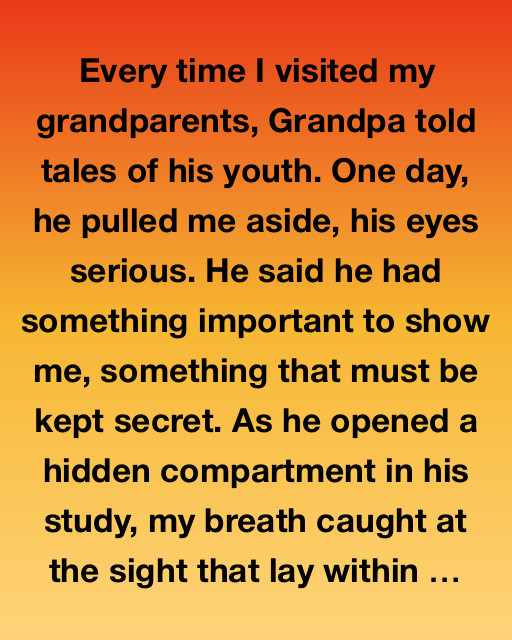 Every time I visited my grandparents, Grandpa told tales of his youth. One day, he pulled me aside, his eyes serious. He said he had something important to show me, something that must be kept secret. As he opened a hidden compartment in his study, my breath caught at the sight that lay within—a dusty old compass that seemed ordinary at first glance. But Grandpa’s eyes twinkled with a mysterious excitement, signaling that this was no ordinary object.