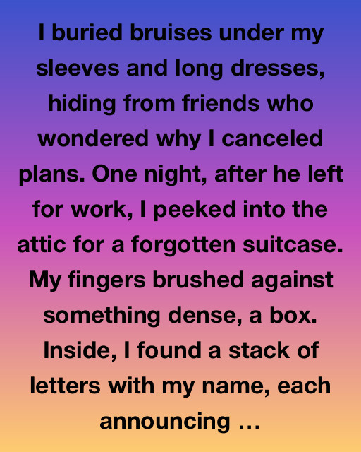 I buried bruises under my sleeves and long dresses, hiding from friends who wondered why I canceled plans. One night, after he left for work, I peeked into the attic for a forgotten suitcase. My fingers brushed against something dense, a box. Inside, I found a stack of letters with my name, each announcing a hidden world of words.