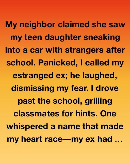 My neighbor claimed she saw my teen daughter sneaking into a car with strangers after school. Panicked, I called my estranged ex; he laughed, dismissing my fear. I drove past the school, grilling classmates for hints. One whispered a name that made my heart raceโmy ex had a brother who was troublesome.