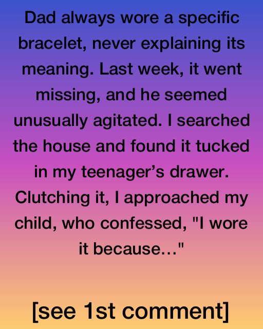 Dad always wore a specific bracelet, never explaining its meaning. Last week, it went missing, and he seemed unusually agitated. I searched the house and found it tucked in my teenagerโs drawer. Clutching it, I approached my child, who confessed, “I wore it because I wanted to feel close to him. I’m sorry, I didn’t know it was important.” My heart melted at those words, yet I knew I had to get to the bottom of the bracelet’s significance.