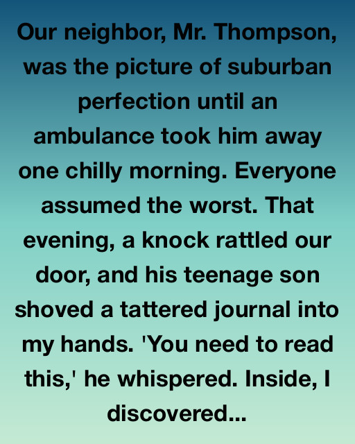 Our neighbor, Mr. Thompson, was the picture of suburban perfection until an ambulance took him away one chilly morning. Everyone assumed the worst. That evening, a knock rattled our door, and his teenage son shoved a tattered journal into my hands. ‘You need to read this,’ he whispered. Inside, I discovered a world unlike the one we imagined Mr. Thompson lived in.