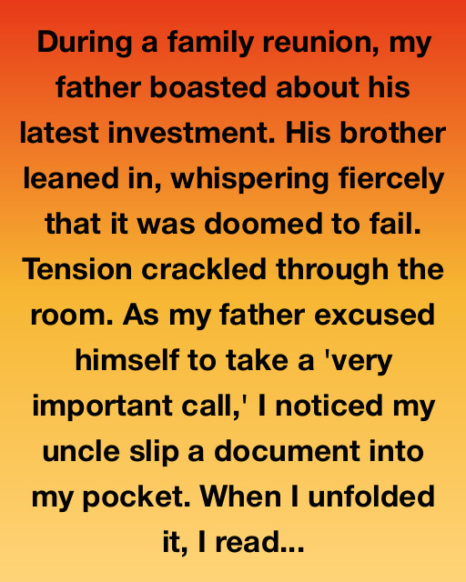 During a family reunion, my father boasted about his latest investment. His brother leaned in, whispering fiercely that it was doomed to fail. Tension crackled through the room. As my father excused himself to take a ‘very important call,’ I noticed my uncle slip a document into my pocket. When I unfolded it, I read that the investment was tied to a land development scam uncovering serious ecological damage.