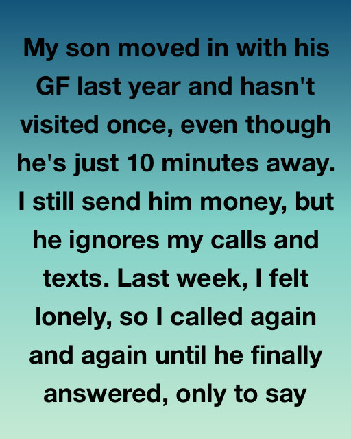 My son moved in with his GF last year and hasn’t visited once, even though he’s just 10 minutes away. I still send him money, but he ignores my calls and texts.