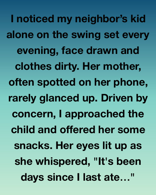 I noticed my neighborโs kid alone on the swing set every evening, face drawn and clothes dirty. Her mother, often spotted on her phone, rarely glanced up. Driven by concern, I approached the child and offered her some snacks. Her eyes lit up as she whispered, “It’s been days since I last ateโฆ”