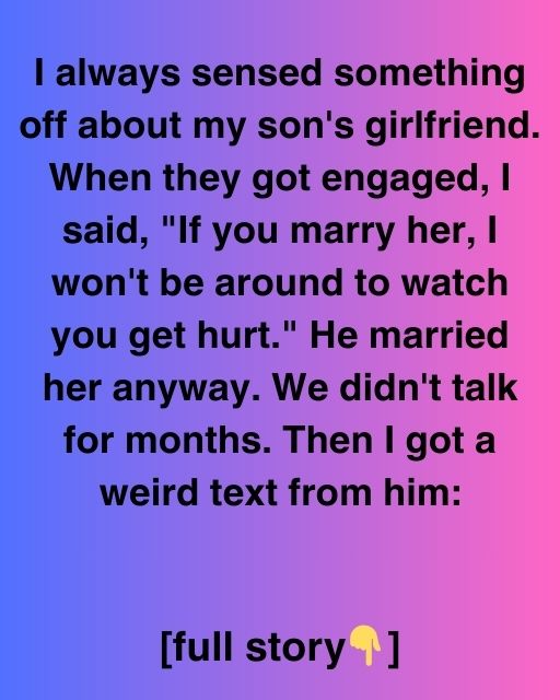 I always sensed something off about my son’s girlfriend. When they got engaged, I said, “If you marry her, I won’t be around to watch you get hurt.” He married her anyway. We didn’t talk for months. Then I got a weird text from him: