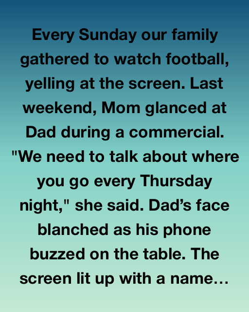Every Sunday our family gathered to watch football, yelling at the screen. Last weekend, Mom glanced at Dad during a commercial. “We need to talk about where you go every Thursday night,” she said. Dad’s face blanched as his phone buzzed on the table. The screen lit up with a name, and even from afar, I could read, “Sarah Jenkins.”
