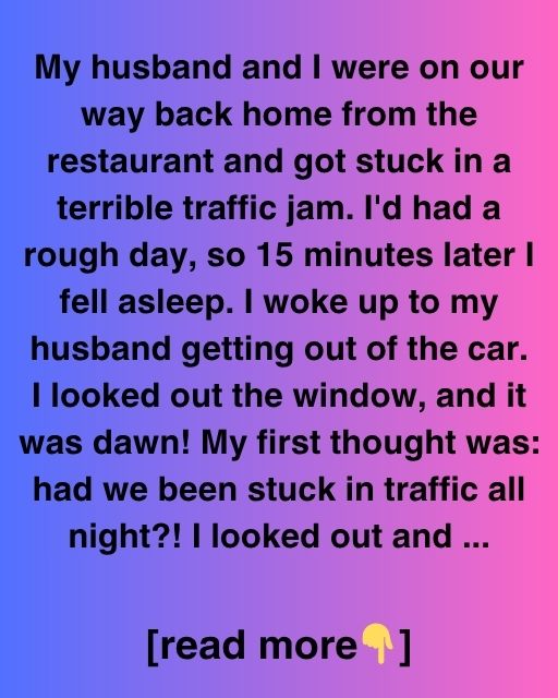 My husband and I were on our way back home from the restaurant and got stuck in a terrible traffic jam. I’d had a rough day, so 15 minutes later I fell asleep. I woke up to my husband getting out of the car. I looked out the window, and it was dawn! My first thought was: had we been stuck in traffic all night?! I looked out and realized we were no longer on the highway.