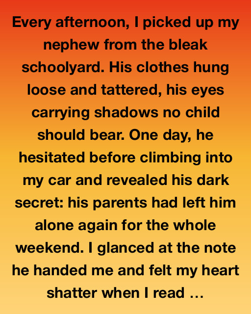 Every afternoon, I picked up my nephew from the bleak schoolyard. His clothes hung loose and tattered, his eyes carrying shadows no child should bear. One day, he hesitated before climbing into my car and revealed his dark secret: his parents had left him alone again for the whole weekend. I glanced at the note he handed me and felt my heart shatter when I read the jumbled scribble of his mom’s handwriting, saying they’d gone on another ‘adventure’.