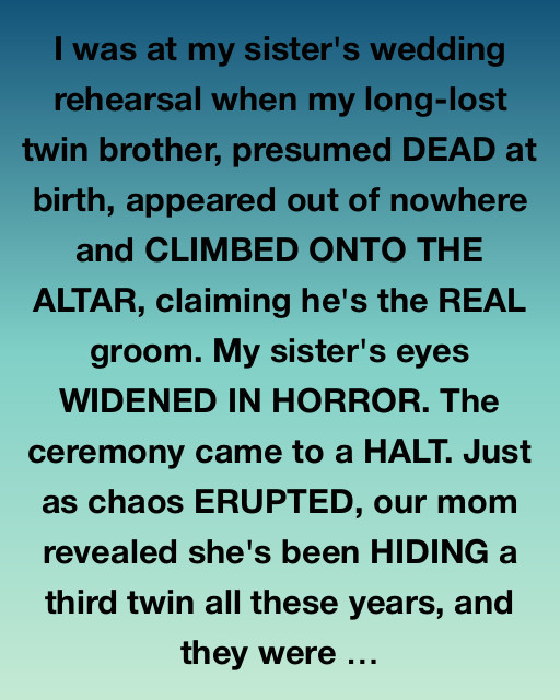 I was at my sister’s wedding rehearsal when my long-lost twin brother, presumed DEAD at birth, appeared out of nowhere and CLIMBED ONTO THE ALTAR, claiming he’s the REAL groom.