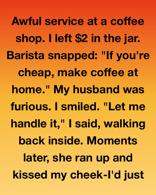 Awful service at a coffee shop. I left $2 in the jar. Barista snapped: “If you’re cheap, make coffee at home.” My husband was furious. I smiled. “Let me handle it,” I said, walking back inside. Moments later, she ran up and kissed my cheek—I’d just paid off the shop’s overdue utility bill, solving the immediate crisis that was ruining her life and her attitude.